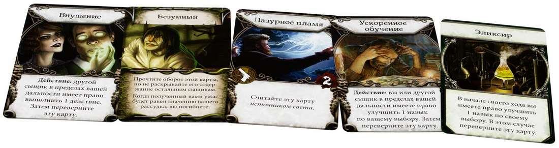 І включає в себе всі необхідні для цього компоненти – нові тайли, жетони, маркери, фігурки монстрів, сищиків, нові карти, які як вносять розмаїття в уже існуючі колоди, так і додають новий тип предметів – еліксири.