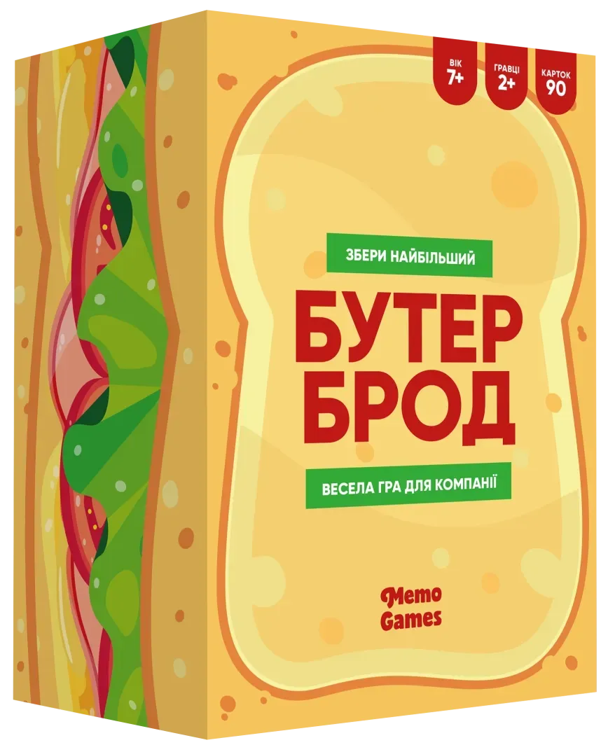 Бутерброд — швидка й шалено весела карткова гра для всієї родини! Збирайте найдивовижніші бутерброди з карток-інгредієнтів, що додають або забирають бали, і використовуйте картки дій, аби перехитрити суперників. У вашому сендвічі можуть опинитися все: від соковитих начинок до… тухлих яєць чи навіть старої шкарпетки!