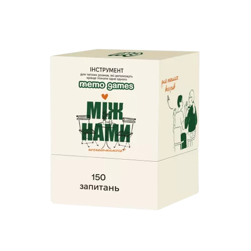 Між нами: Познайомимось? — це проста й тепла гра для легкого старту будь-якої розмови. 150 запитань допоможуть розговоритися, краще пізнати людину поруч і відкрити щось нове про себе. Просто витягніть картку — і спілкування стане живим, щирим та цікавим.