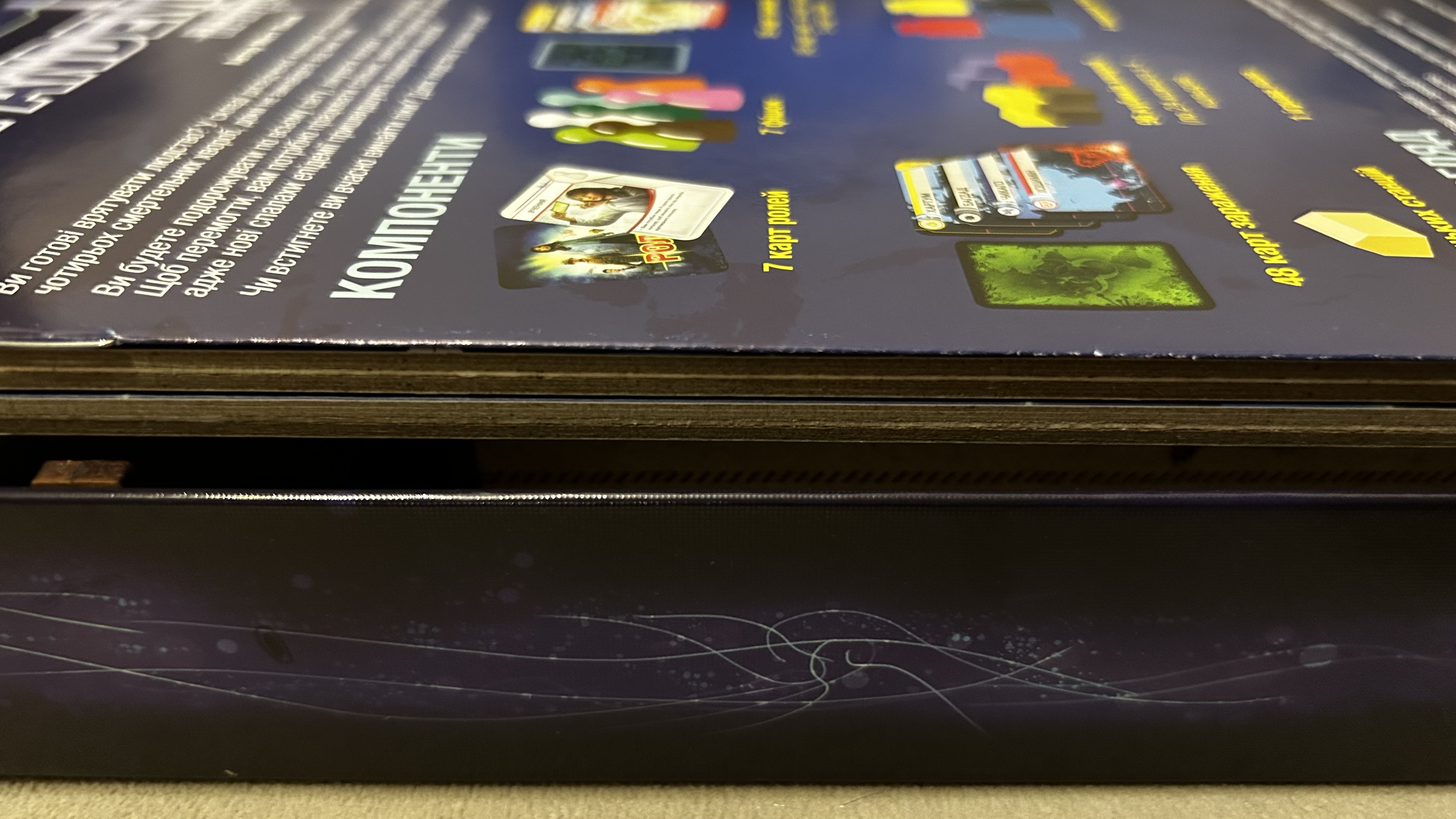 Сьогодні зібрав свій органайзер і мушу сказати, що ситуація аналогічна з тим, про що писав пан Євген - органайзер ледве вліз у коробку. Всі частини були зібрані щільно і перевірені на двох коробках - від оригінальної гри, та допа "На межі". Є острах, що коробка з часом просто розлізеться. Будь ласка, допрацюйте органайзер, бо мені подобається ваша продукція і відверто не хочеться залишати такі відгуки. Також хочу зазначити, що мапа і журнали терористів доволі помітно піднімають кришку коробки. Якщо всі картки одягнути в ваші преміумні протектори, то вони просто не влізуть по висоті у всі наявні треї