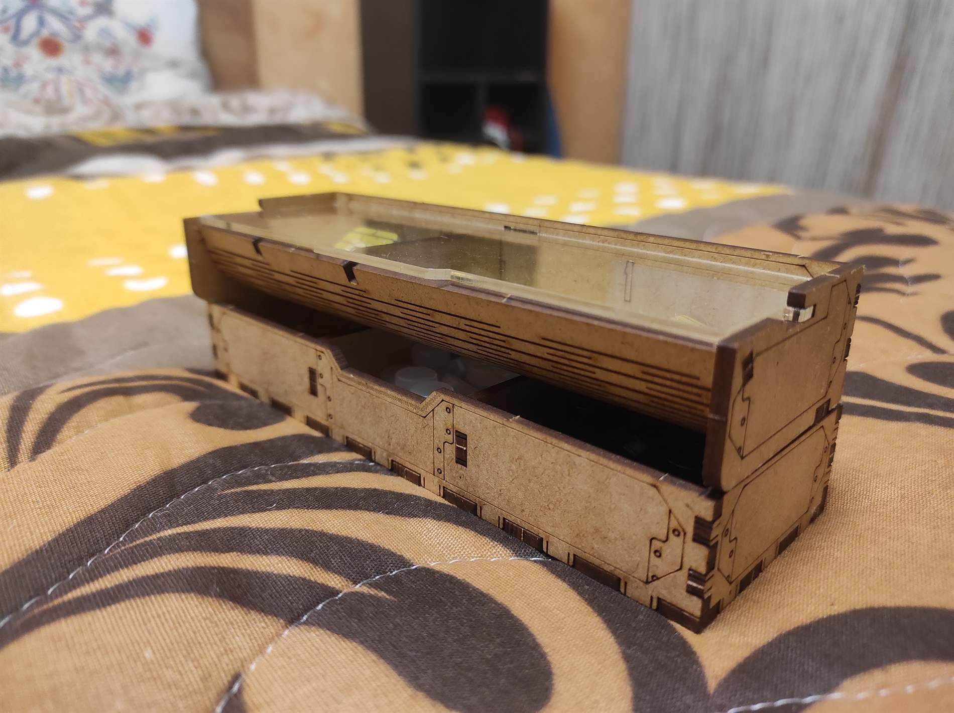 Отсек для фишек зданий помещается под отсек для мегакредитов, но последний с одной стороны снизу в форме лодочки, и не полностью закрывает нижний отсек с фишками, из-за чего фишки могут немного перемшиваться друг с другом, но свой общий отсек не покидают.