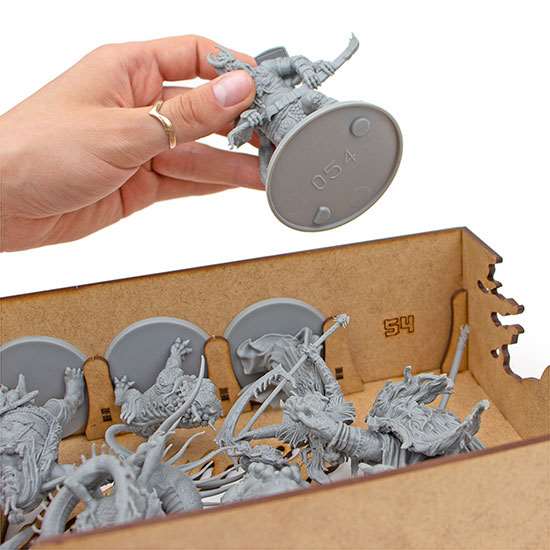 Чудовий органайзер. Я взагалі фанатію від деревʼяних органайзерів, а цей перший у мене для гри з фігурками. Дуже цікаво зроблений. Якщо коробку сильно трусити або тримати боком, фігурки кланів заваляться, але монстри чудово припасовані. Круто, що є місце для upgrade kit (уже замовив себе).
