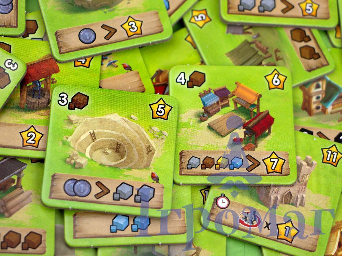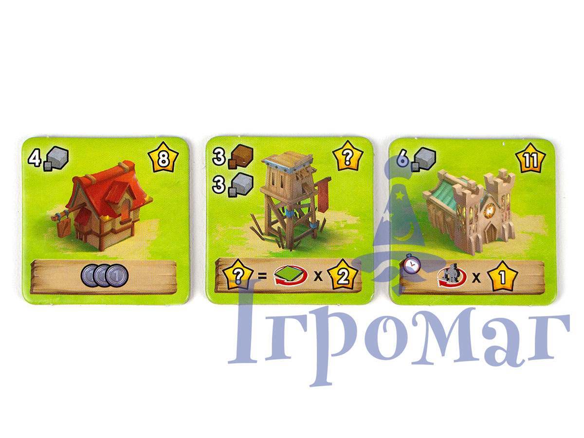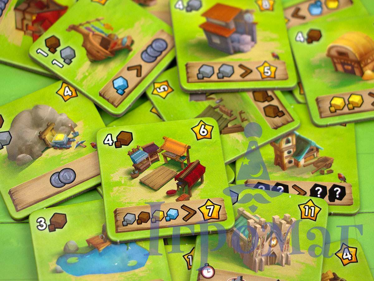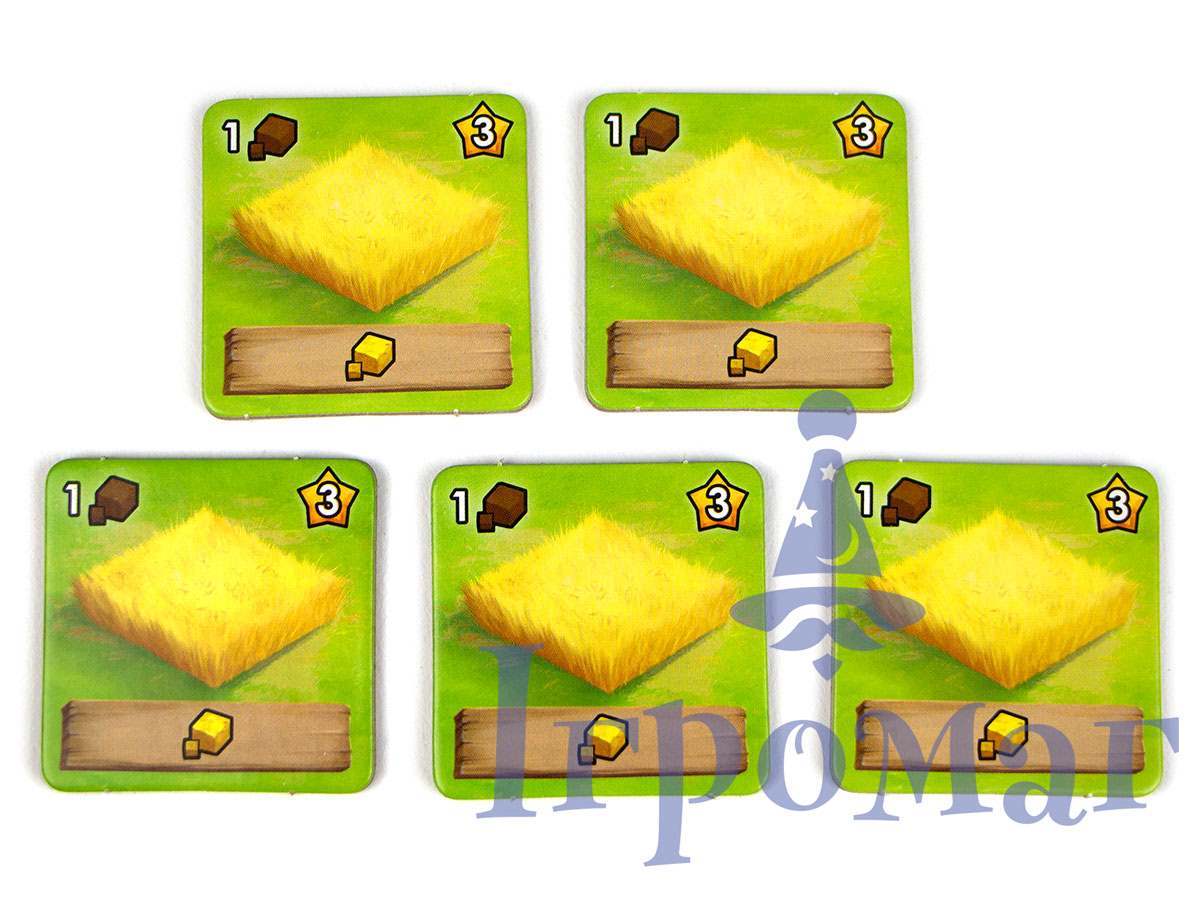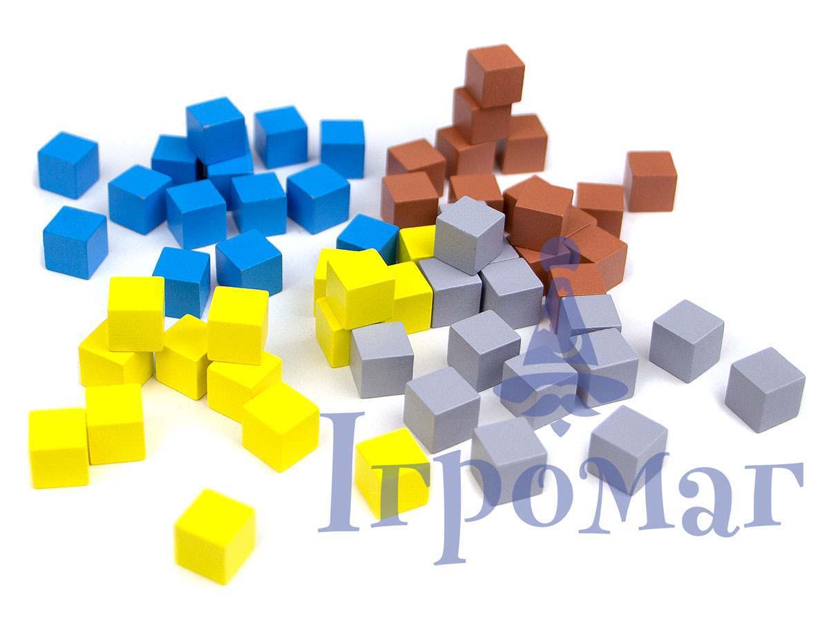 - 60 кубиків ресурсів (по 15 каменю, деревини, риби та пшениці)