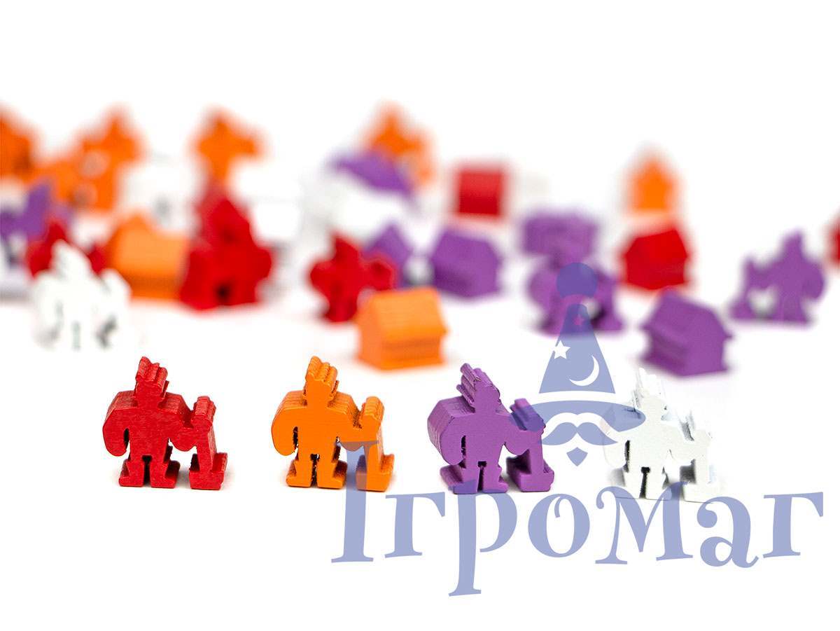 - 28 токенів будиночків (по 7 білих, помаранчевих, червоних і фіолетових)