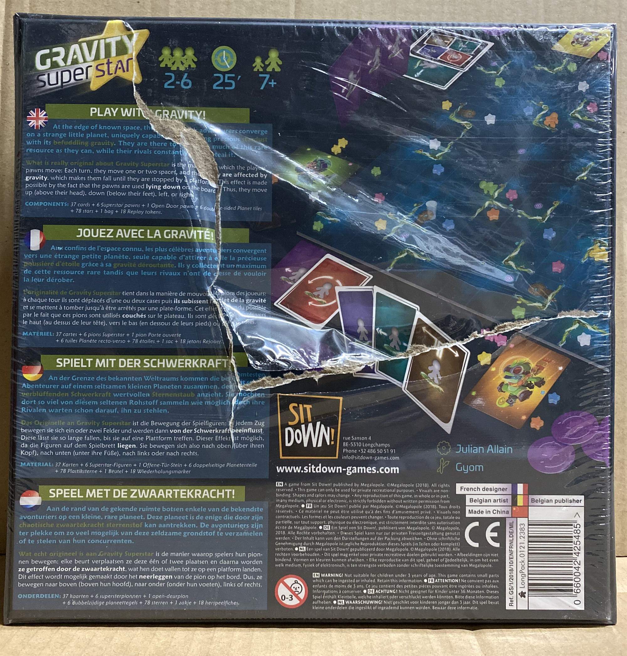 «Gravity Superstar» - це чарівна і барвиста настільна гра для 2-6 гравців, заснована на механіці збору сетів (комплектів) різнокольорових зірок.