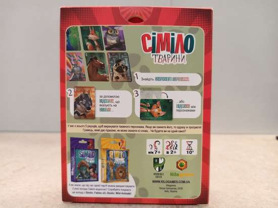 «Сіміло: тварини» — кооперативна настільна гра для веселої компанії. Усі мають об'єднатися та відшукати таємного персонажа за підказками. Нумо випробовувати свою інтуїцію!Тип: карткова, кооперативна, на дедукцію
