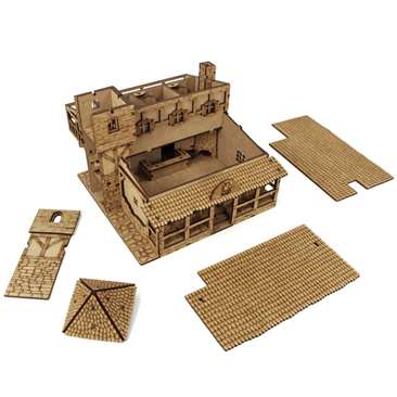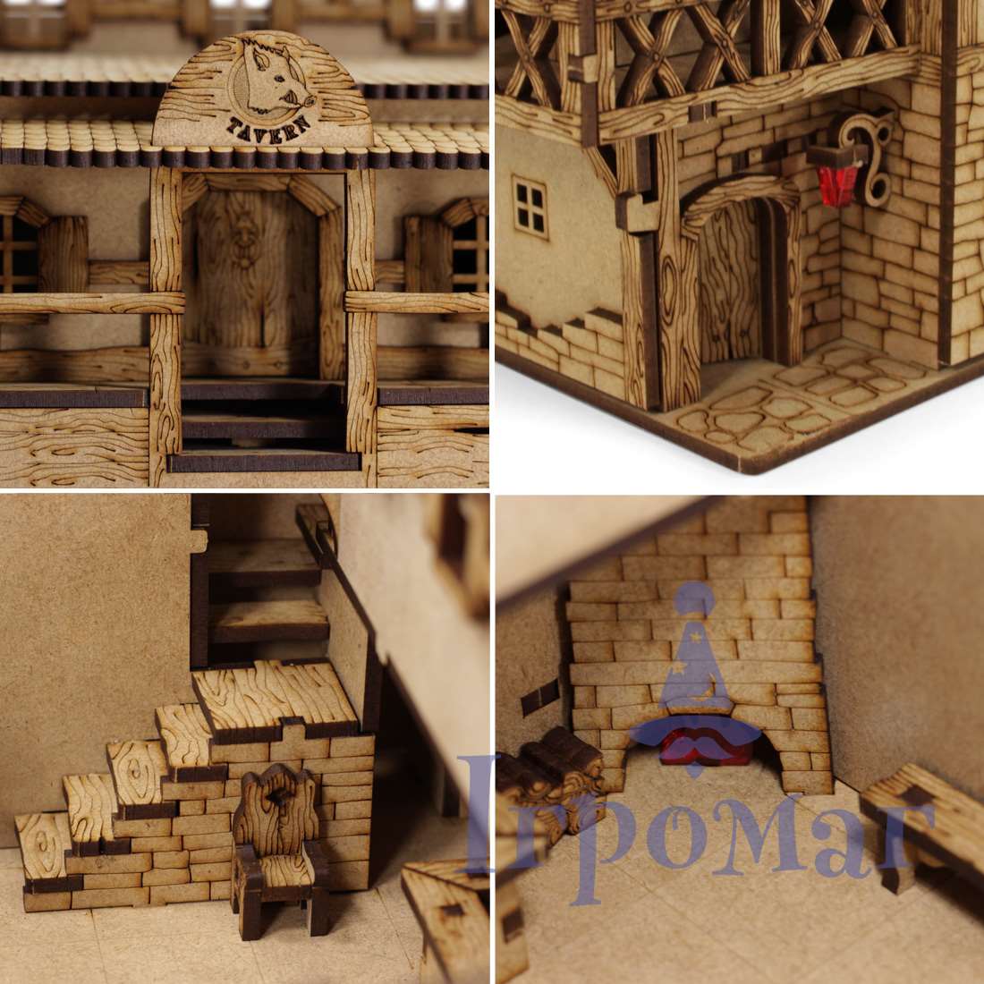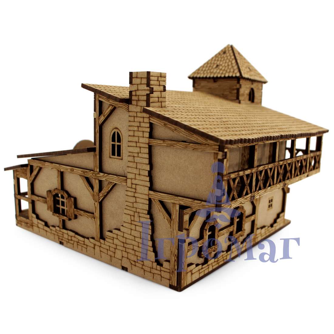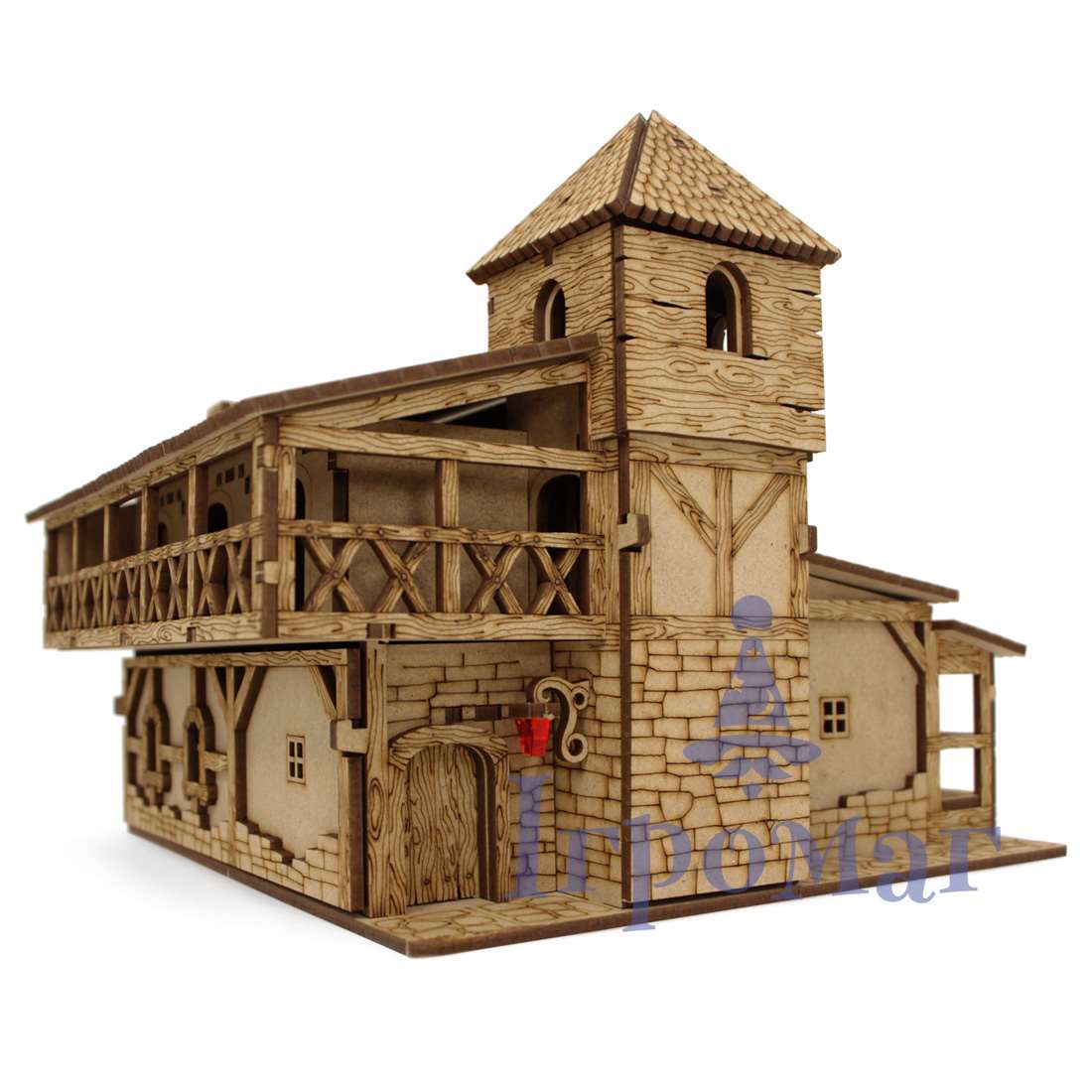 Пропонуємо вам чудову двоповерхову модель таверни з невеликою вежею. Дах будівлі знімний, і всередині знаходиться великий зал з барною стійкою, а на другому поверсі присутні три окремі кімнати. Модель дуже стильна і вигідно впишеться в сеттинг практично будь-якої пригоди!