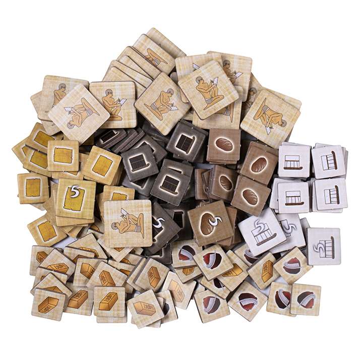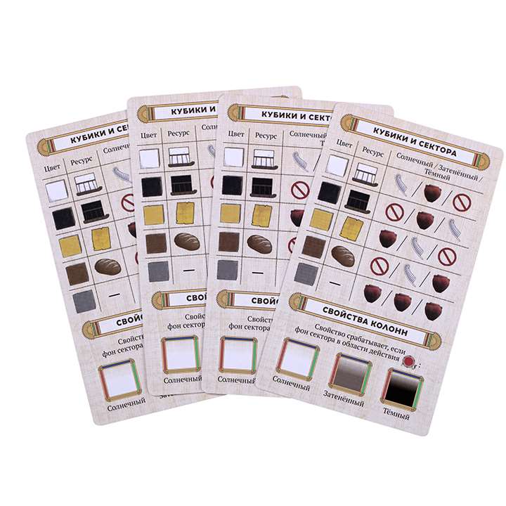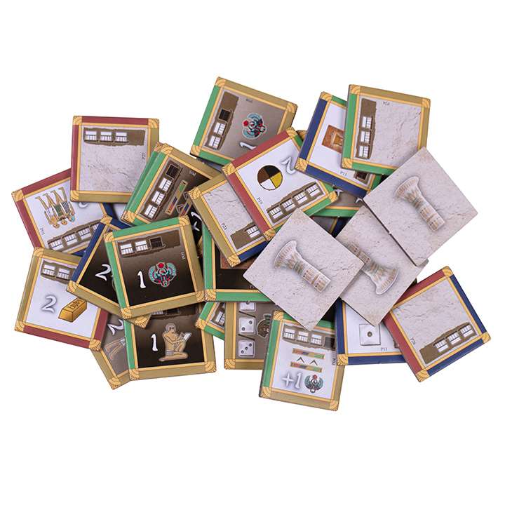 Центром гри є обеліск, що розміщується в центрі колеса на ігровому полі. Колесо розділено на 6 секторів, 2 сонячних (білих), два затінені (сірі) та два темні (чорні) сектори. На цих секторах на початку кожного з 16 раундів розміщуватимуться кубики, і вони будуть рухатися між трьома секторами. Колір сектору означає тінь, яку відкидає обеліск на цю частину колеса та впливає на значення кубиків. Кубики, відносно своїх кольорів поділені на чисті, забруднені та заборонені та відповідають певним ресурсам в грі: чорний кубик – граніт, білий – вапняк, коричневий – хліб, жовтий – папірус.