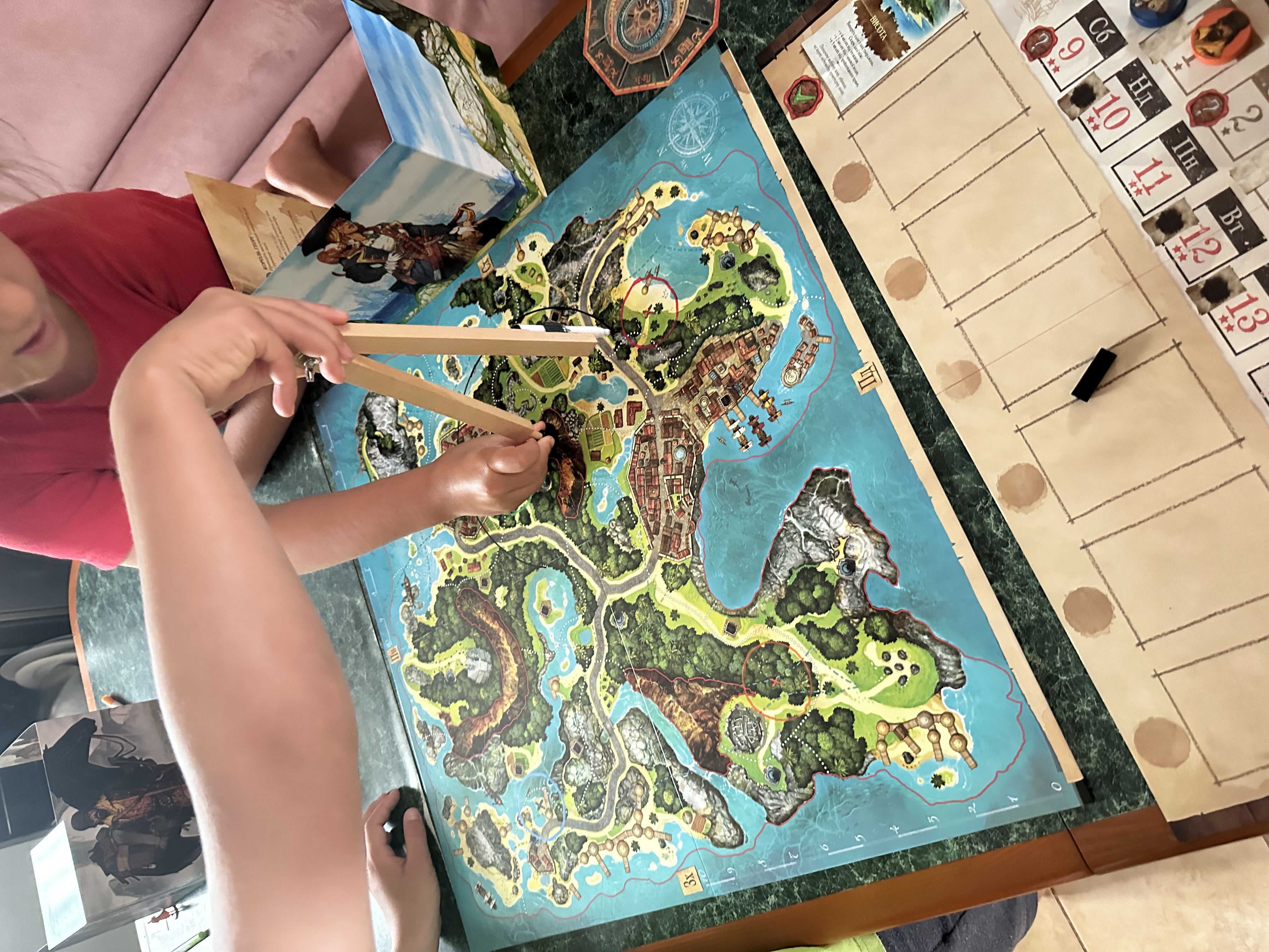 Острів скарбів реалізовує абсолютно унікальний підхід до настільних ігор, пропонуючи гравцям визначати відстань не за допомогою клітинок чи зон, а з допомогою цілковито звичних способів вимірювання відстані! І надає для цього всі необхідні інструменти, від лінійок до циркулів, тож щоб знайти скарби, нам доведеться використовувати всі можливі підказки та інструменти :)