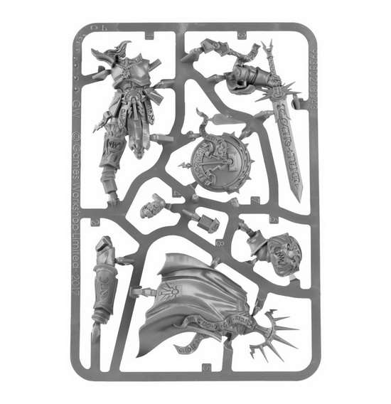 - 8 компонентів на пластиковій рамці для збирання 1 мініатюри Лорда-Селестанта Гавріеля Вірне Серце (Lord-Celestant Gavriel Sureheart);