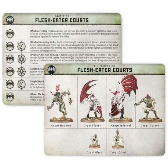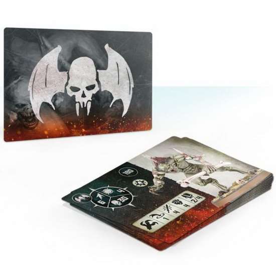 Комплектація набору «Warhammer Age of Sigmar. Warcry: Flesh-Eater Courts Card Pack»: – Карти здібностей на декількох мовах, включно з російською; – Декілька карт бійців та карт-розділювачів для відстеження жетонів станів;