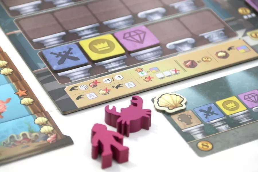 А на затонулих кораблях ваші дайвери шукатимуть скарби, які ви буде розміщувати у своєму сховищі. За кожен унікальний скарб у сховищі, а також за викладені однотипні скарби в один ряд ви отримаєте переможні бали. Цікаво, що коли ви пірнаєте за скарбами до корабля, де вже знаходиться інший дайвер (ваш чи суперника), він також отримає скарби, тому групування дайверів принесе значну нагороду. А ось дайвера суперника завжди можна «викинути» на пляж.