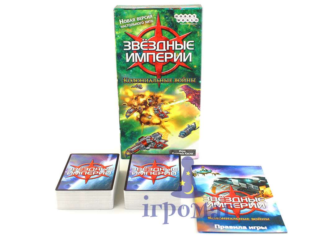 «Зоряні імперії: Колоніальні війни» – колодо будівнича стратегія, у котрій кожному з учасників належить почати з маленького флоту та, за допомогою війн, торгівлі і політики, створити могутню зоряну імперію. У цьому наборі ви знайдете нову торгову колоду та зрадієте модерновим механікам та цікавим можливостям.