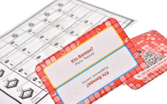 Возможно игрокам придется догадаться «кто Валера?» или «что именно он делает»? В любом случае в заданиях множество достаточно двусмысленных выражений и слов, которые можно показывать по-разному. А как именно, решать игрокам. Главное успеть объяснить это за 45 секунд!