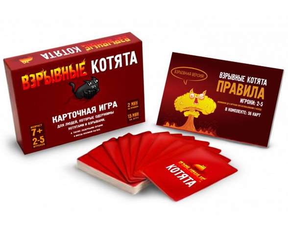Взрывные котята (Взрывные котята) – это игра рекордсмен Kickstarter, где появилась под названием Exploding kittens и собрала миллионы за короткий срок. А потом еще и обзавелась несколькими дополнениями, поклонниками, последователями и фанатами в каждом уголочке мира. Вот и вам предлагаем взглянуть повнимательнее на снующих туда-сюда котят, пока они не подкинули вам взрывающихся сюрпризов.Тип: карточная, филлер