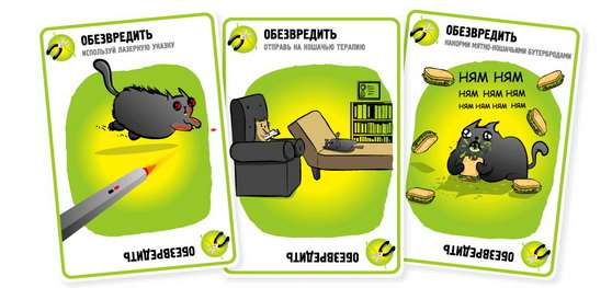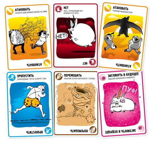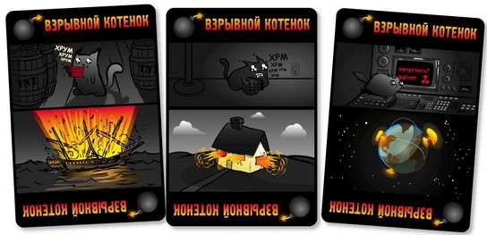 Часть карт игры представляет собой просто картинки, которые можно взять из колоды и, выдохнув, просто полюбоваться. Ведь главное не потянуть карту со Взрывающимся котиком. Как вы поняли, такой неудачник сразу же проигрывает партию и выбывает. Остальные карты помогают либо избежать этой участи самому, либо подвести противника поближе к заряженной в колоде бомбе. Именно с помощью таких карт со способностями вы будете передавать свой ход другим участникам, замешивать карты в колоду как вам хочется, подглядывать, какие именно карты находятся следующими в колоде или же заставлять противника брать не одну, а несколько карт сразу.