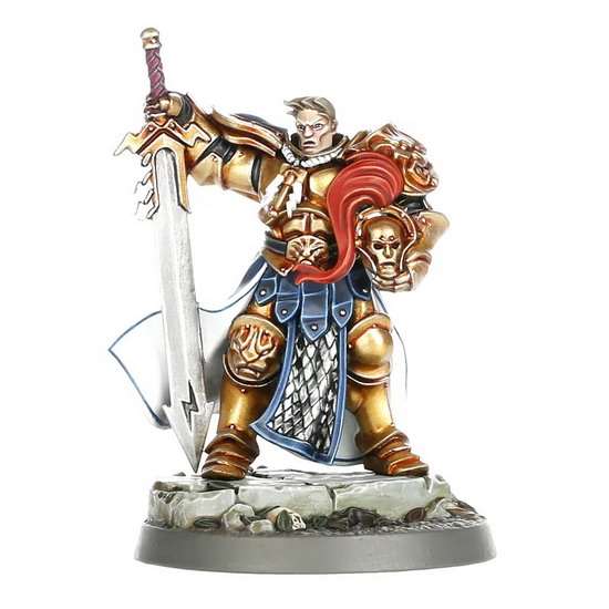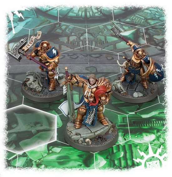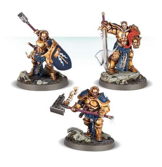 – Три синие сборные пластиковые миниатюры Stormcast Eternals: Severin Steelheart, Obryn the Bold, Angharad Brightshield;