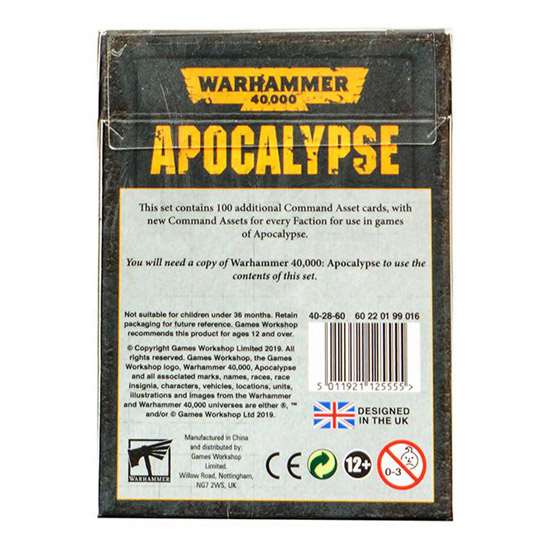 Данная колода содержит 100 дополнительных карт командных активов для расширения до 300 карт базовой колоды, включенной в набор Warhammer 40,000: Apocalypse. Помимо универсальных карт, которые доступны для использования любой фракцией, и специальных карт для каждой отдельной фракции в предлагаемой колоде присутствуют новые карты. Они откроют вам множество новых тактических и стратегических приемов в процессе битвы.