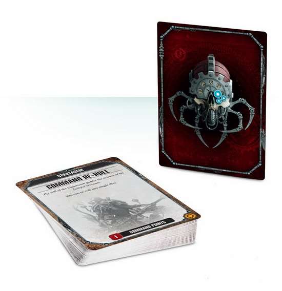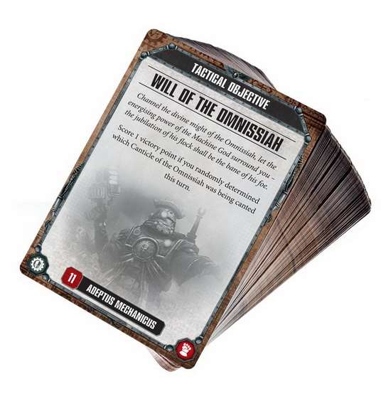 – 28 карт стратагем для армии Адептус Механикус, включая 7 специальных стратагем и одна специальная для Квестор Механикус и 3 основных стратагемы (Command Re-roll, Counter-Offensive, Insane Bravery).
