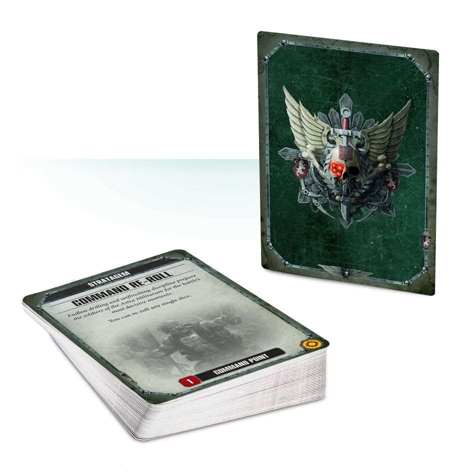 – 25 карт Стратегем. Это Стратегемы, уникальные для Астра Милитарум, включая 8 карт Стратегем для разных полков Астра Милитарум и 3 базовые Стратегемы из общих правил Warhammer 40 000, которые доступны всем армиям;